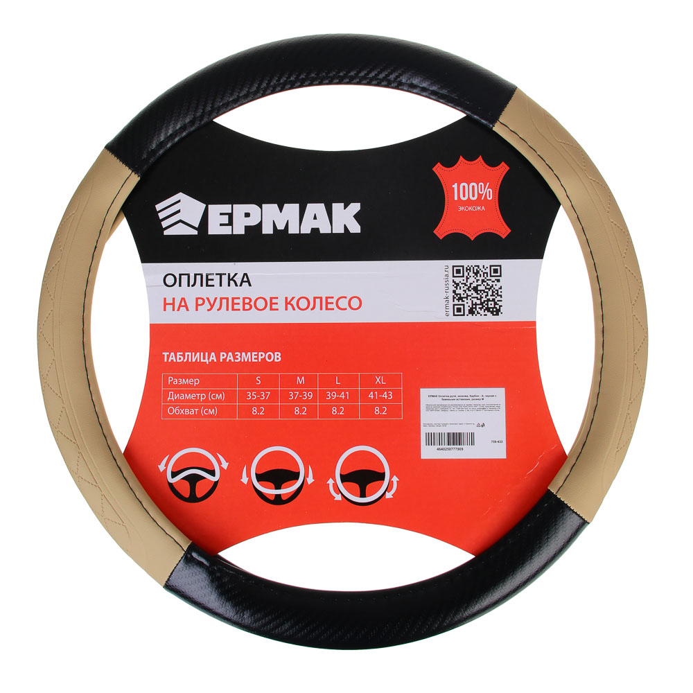 Количество товара ЕРМАК Оплетка руля, экокожа, Карбон - А, черная с бежевыми вставками, размер М