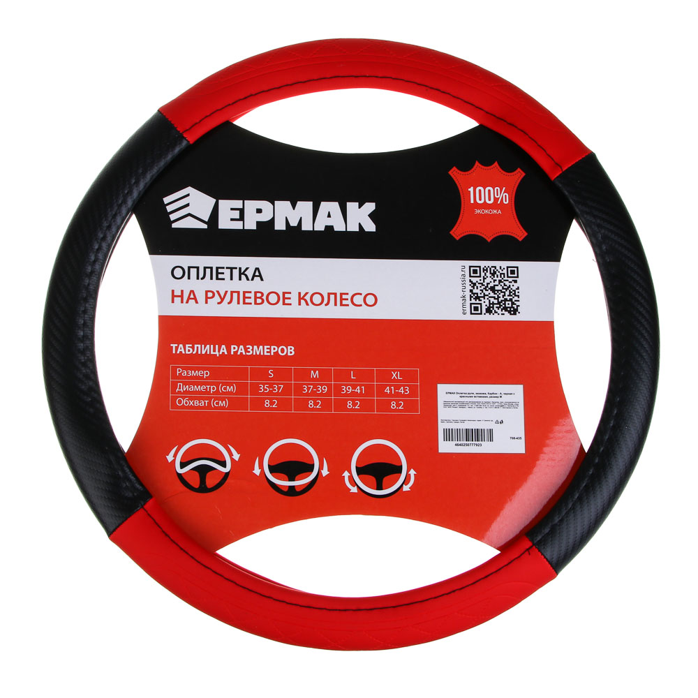 Количество товара ЕРМАК Оплетка руля, экокожа, Карбон - А, черная с красными вставками, размер М